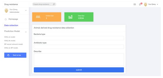 (2) The basic data collection module was the basis for drug resistance monitoring, including drug information, pathogen information, time information, and other parameters. This provided basic data reference for the operation of the system and guided the steps of drug resistance prediction. The data collection page is shown in Figure 7.