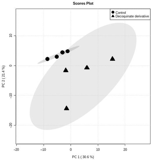 Principal component analysis (PCA) was initially used to get an overview of the natural grouping of metabolic data (Figure 1). The total variance described by the first two principal components (PCs) was 52%, of which PC1 accounted for 30.6% and PC2 for 21.4%, respectively. The PCA scores plot of the metabolite data analyzed by GCxGC-TOFMS shows clear clustering between Mtb treated with DQ derivative RMB041 and those cultures that were not (Figure 1). The scores plot also shows that the variance of the treated Mtb group is clearly greater than the controls, as a result of greater variance in the metabolite concentrations.
