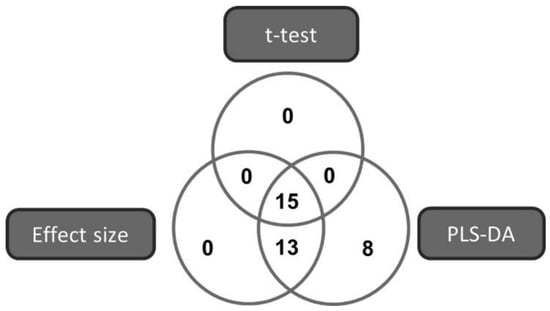Using MetaboAnalyst (Version 5.0, https:www.metaboanalyst.ca, accessed on 3 May 2021) [98], two multivariate statistic methods were applied: (1) an unsupervised principal component analysis (PCA) and (2) a supervised partial least squares-discriminant analysis (PLS-DA) [99]. Additional univariate statistics were also calculated via (1) t-test and (2) effect size values [36].