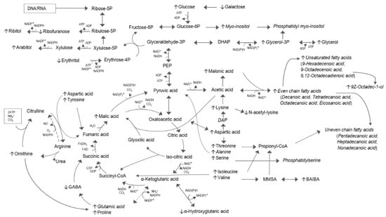 Metabolomic pathway map of DQ derivative RMB041-treated Mtb. The metabolite markers best describing the variation in the metabolome compared to that of untreated Mtb are represented with up or down arrows, indicating elevated or reduced concentrations, respectively. The dotted lines represent flux of amino acids from nucleotide degradation into the central carbon metabolism. Metabolites that are incorporated into the cell wall are indicated in italic.