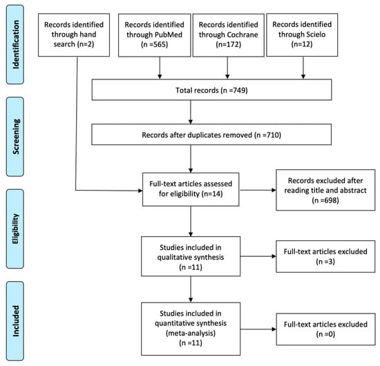 Through the electronic search, a total of 749 records were identified. After discarding the duplicates, 710 titles and, if necessary the abstracts, were read to assess the potential for inclusion. A total of 698 studies were excluded. The full text of the remaining 12 articles and the two works identified through hand search were evaluated to verify they met the inclusion/exclusion criteria [,,,,,,,,,,,,,]. One was discarded because it was a quasi-random controlled clinical trial [], a second one was excluded because the assessed variable was not early implant failure [] and another was ruled out because the follow-up period was 8 weeks []. Finally, 11 studies were included in the qualitative analysis [,,,,,,,,,,] (Figure 1).