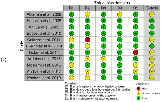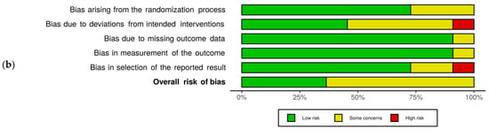 Risk of bias within the included studies. (a) Traffic light plots of the domain-level judgements for each individual study; (b) weighted bar plots of the distribution of the risk of bias judgement for each domain.