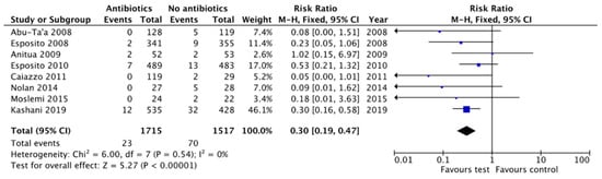 Different pooled estimates were performed using a fixed effect-model because heterogeneity was I2 < 40%. The prescription of antibiotic prophylaxis, regardless of the dosage or the time of administration, proved to be a protective factor for early implant failure, with statistically significant results (RR = 0.30, 95% CI: 0.19–0.47, p < 0.00001; heterogeneity I2 = 0%, p = 0.54) [,,,,,,,] (Figure 3).