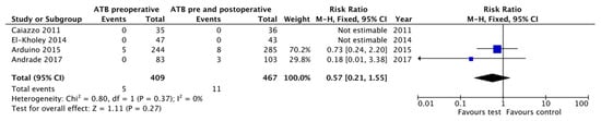 The meta-analysis comparing preoperative antibiotics versus pre- and postoperative antibiotics did not show differences between groups (RR = 0.57, 95% CI: 0.21–1.55, p = 0.27; heterogeneity I2 = 0%, p = 0.37) [,,,]. It must be considered that in two of the three studies included there was no implant failure in either of the two groups [,], so the effect of the different antibiotic regimens in these two studies was not estimable. For this reason, the result depended only on two studies [,] (Figure 4).