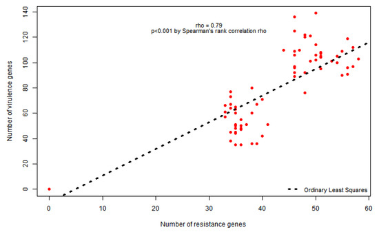 Overall, the genome sequencing identified 299 different virulence genes among all the pathogens. There was a strong positive correlation between the number of resistance and virulence genes carried by each isolate (Rho = 0.79; p = 0.001) (Figure 1).