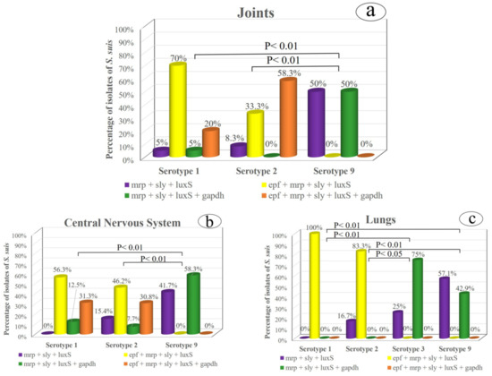 The assessment of virulence factors being present in the most frequent serotypes showed that the serotype 1 and 2 profiles differed significantly from those found in serotypes 3 and 9 (p < 0.01). Thus, the two most common patterns in serotypes 1 and 2 were epf + mrp + sly + luxS and epf + mrp + sly + luxS + gapdh, while these combinations were absent in serotypes 3 and 9. However, the main virulence profiles in serotypes 3 and 9 were mrp + sly + luxS and mrp + sly + luxS + gapdh. Concerning the isolation site regardless of serotypes, the virulence patterns differed significantly only between the joints and lungs (p < 0.05), mainly because of the absence of the epf + mrp + sly + luxS + gapdh profile in the lungs.