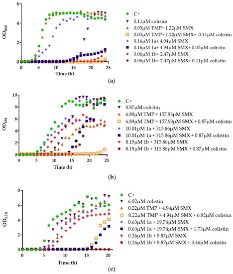 Effects of TMP, 1a and 1b when tested in combination with SMX (1:20) and in the presence of sublethal concentrations of colistin on the growth curve of (a) E. coli ATCC 25922, (b) P. aeruginosa PAO1, and (c) S. marcescens NIMA.