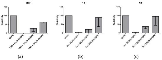 Like TMP, compounds 1a and 1b are potent inhibitors of DHFR. Both analogues inhibited the activity of this enzyme by >80%. All three inhibitors were then tested in E. coli supplied with increased concentrations of the DHFR cofactor NADPH and the substrate H2F. The reaction without inhibitors served as the reference (100% activity). In the reactions with TMP or its analogues, increasing concentrations of NADPH resulted in the increased enzyme activity (Figure 4). The enzyme activity was the highest at the highest tested concentration of NADPH (240 µM).