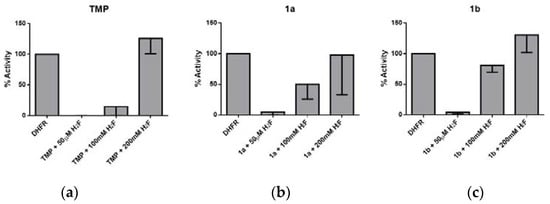 Percentage of activity of E. coli DHFR after a 30-min incubation. Each histogram represents the activity of DHFR in the presence of different concentrations of H2F and 5 µM of the inhibitors (a) TMP, (b) 1a and (c) 1b. The data are expressed as a percentage with respect to the control.