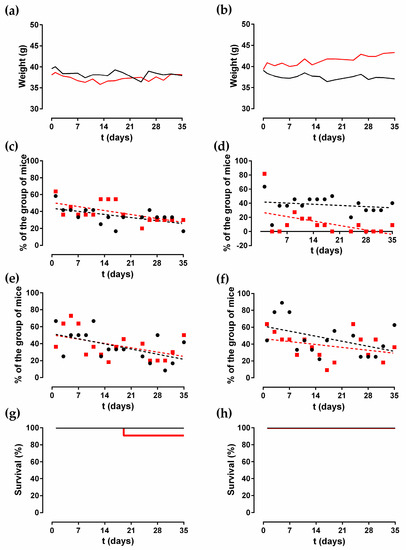 Median weight (a,b), limping (c,d), piloerection (e,f), and survival (g,h) in different noninfected groups (black) and in the Cal 35-infected group (red) with insertion of CP (left column) and CP + A implant (right column) over time.