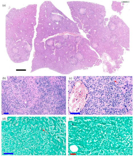 Histological section of the liver of a mouse of the CP Cal35 group that died of CMV infection (a) and histological sections with a greater increase in H&E (b,c) and Groccot’s silver stain (d,e). Black, blue, and red bars represent 2 mm, 50 µm, and 20 µm, respectively. The liver of the animal showed parenchyma with foci of necrosis and a polymorphonuclear-type inflammatory infiltration accompanied by occasional Grocott-positive intracellular inclusions inside some hepatocytes, which was compatible with a cytomegalovirus infection. An acute necrotising inflammatory reaction was detected around the central veins.