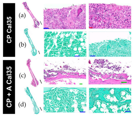In the Cal35-infected group with CP implants, acute osteomyelitis was observed in four of the five femurs (Figure 6a); no chronic osteomyelitis was diagnosed, and the presence of yeast was also detected in four of the five femurs on Grocott’s silver staining (Figure 6b). In the Cal35-infected group with CP + A-implants, acute osteomyelitis was observed in two of the five femurs (Figure 6c,d), chronic osteomyelitis was diagnosed in two of the five femurs, and presence of yeast was detected in only one of the five femurs following Grocott´s silver staining; the latter also showed the presence of acute osteomyelitis. Only one mouse (9.1%) in the noninfected group of animals with a CP + A-implant died (Figure 3). The deceased mouse from this group showed signs of having had diarrhoea, enteritis, and hepatomegaly. Furthermore, when the operated femur, both kidneys, and a piece of the liver were sent for microbiological study, no growth in aerobic or facultative anaerobic bacteria or fungi was detected.