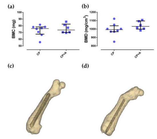No differences were observed between the bone mineral content (BMC) and bone mineral density (BMD) of the groups of mice with CP- and CP + A-implants (p = 0.835, and p = 0.181, respectively). The BMD results were perfectly comparable as there were no differences in BMC between the compared groups (Figure 7).
