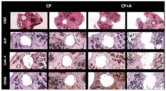 Hematoxilin-eosin staining showed no differences in tissue in the area occupied by the implant among the mice with CP- and CP + A-implants. When bone markers were analysed in the defect area, no changes were observed among the different animals, in alkaline phosphatase (ALP) staining, Cathepsin K or cluster of differentiation 68 (CD68) (Figure 8).