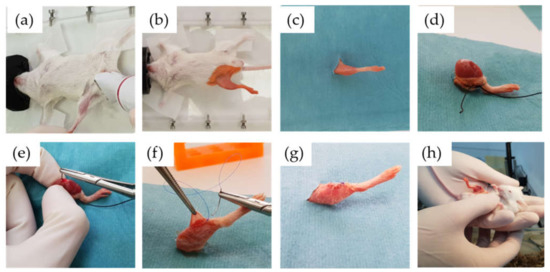 Surgical procedure: inhaled anaesthesia and shaving of the limb (a), antiseptic washing and isolation of the surgical field (b,c), skin dissection and exposure of the bony entry point (d), retrograde introduction of the biomaterial into the femur of the mouse (e), suture and cleaning of the surgical wound (f,g), awakening and care of the animal (h).