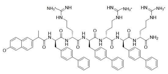 Antimicrobial peptides have received great attention as potential candidates for antimicrobial drug development due to their broad-spectrum antimicrobial activity []. Recently and due to difficulties and challenges facing AMPs development into clinically active agents as a result of their toxic nature and high manufacturing costs, recent efforts have focused on the development of ultrashort antimicrobial peptides (USAMPs). This group of peptides exhibit several advantages such as short amino acid sequences which would facilitate large-scale production of these peptides on an economical scale []. Additionally, USAMPs in general display decreased hemolytic activity when compared with their longer counterparts. The design of USAMPs has to be carefully articulated to create a delicate balance between the structural motifs and features that allow AMPs to attach to bacterial membranes and cause cell lysis []. AMPs cause cell lysis by relying on two major physicochemical property-related events that are crucial for peptide antimicrobial activity. The first event is related to the cationic nature of the peptide as the positively charged amino acids interact with the negatively charged phospholipids of bacterial membranes, this electrostatic interaction between the peptides and the bacterial membranes allows AMPs to aggregate in large numbers on the surface of bacterial membranes and facilitating the initiation of the second event which mainly depends on the hydrophobic nature of the peptide and allows AMPs to orient themselves properly with the amphipathic bacterial membrane layer and penetrate the hydrophobic lipid tail and consequently cause cell lysis and death []. In our study, we have relied on these general assumptions in the design of alapropoginine which is an ultrashort six-amino-acid AMP that displays a net cationic charge of +3. It is believed that the optimal positive charge required for proper and sufficient electrostatic interaction between AMPs and bacterial membranes is in the range of (+3–+6). Alapropoginine is composed of three arginine amino acids which are responsible for the +3 net positive charge of the peptide in addition to three unnatural amino acids represented by biphenylalanine that was specifically chosen to be included in the peptide design as several reports and structural simulation studies are reporting that biphenylalanine acts as a membrane anchor in USAMPs and contributes heavily in the hydrophobic membrane penetration needed for bacterial membrane’s pore formation. Alapropoginine was also conjugated to a carbon side chain composed of 2-(6-methoxynaphthalen-2-yl)propanoic acid. The rationale behind the conjugation strategy is to sustain the hydrophobic grip of the biphenylalanine amino acids and provide a hydrophobic stabilizer to the peptide [].