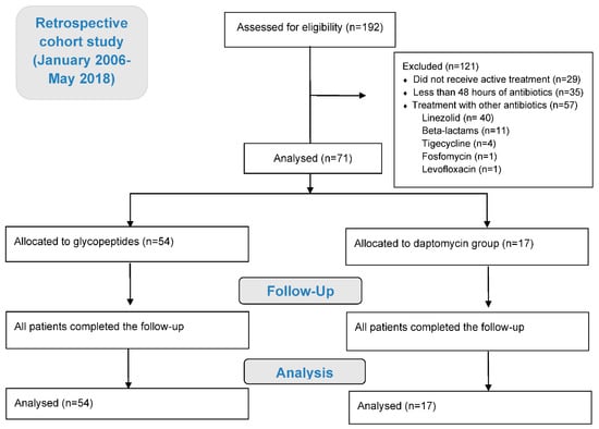 Chicago/Turabian StyleEcheverría-Esnal, Daniel, Luisa Sorli, Nuria Prim, Clara Martin-Ontiyuelo, Juan Pablo Horcajada, and Santiago Grau. 2021. "Daptomycin versus Glycopeptides for the Treatment of Enterococcus faecium Bacteraemia: A Cohort Study" Antibiotics 10, no. 6: 716. https://doi.org/10.3390/antibiotics10060716