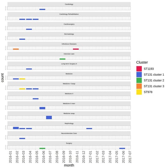 Notably, sporadic isolates belonging to the ST131 cluster 1 were observed till June 2017. Based on phylogenetic data, the first isolate belonging to the ST131 cluster 1 (i.e., the outbreak index strain, coded sk36y36t) was isolated in the Nephrology Ward. The patient had been previously hospitalized for long periods in the past years in both Nephrology and ICU. Of note, the index patient was previously colonized by KPC-Kp (strain code, sk138y138t) (Table 2). The ST131 cluster 2 included two isolates, collected in Surgery and ICU in June and September 2016, respectively. The ST131 cluster 3 was represented by a single isolate, obtained in February 2016 from the Infectious Diseases Ward. ST978 strains were recovered in March 2016 from the blood culture and rectal swab of the same patient (Table 2 and Figure 2). Lastly, the ST1193 strain was isolated in November 2016 in the Infectious Diseases Ward. Figure 2 shows the ward distribution of the KPC-Ec strains belonging to different clusters and STs.