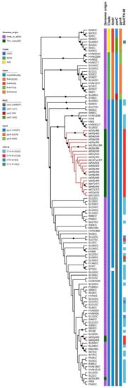 For each of the 35 strains included in the study, the reads quality was assessed using FastqC software (https://www.bioinformatics.babraham.ac.uk/projects/fastqc/, accessed on 29 June 2020), and the low quality terminal bases were trimmed using Trimmomatic software [25]. Reads were assembled using SPAdes software [26].