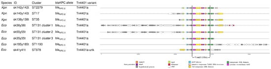 Regarding plasmids, IncFIBpQil was found in all the ST131 and ST1193 KPC-Ec strains, as well as in all the KPC-Kp strains. IncFII was found in all the ST131 cluster 1 and cluster 2 KPC-Ec strains; Col156 was found in all the ST131 cluster 1 isolates but one. IncX3 was detected in both the ST978 isolates. Lastly, all the KPC-Kp strains harbored IncFIB(K)_Kpn3. The KPC-Ec strains belonging to the epidemic ST131 of both cluster 1 and cluster 3 produced the KPC-2 enzyme, as well as the KPC-Kp isolates. The blaKPC-3 allele was instead found in the ST131 cluster 2, ST1193 and ST978 strains. Analysis of the blaKPC surrounding genetic environment showed that all clusters, except ST978 and ST1193, were characterized by a conserved blaKPC scaffold (Figure 4). ST978 and ST1193 showed two different scaffolds. All the clusters harbored the Tn4401a, a structural variant of the Tn4401 transposon.