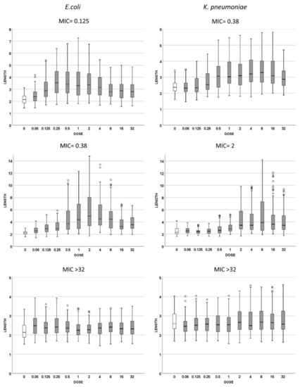 Cell length measures (μm) of Escherichia coli (left) and Klebsiella pneumoniae (right) strains with different MICs for cotrimoxazole. The first row corresponds to susceptible strains with MIC 0.125 mg/L for E. coli and 0.38 mg/L for K. pneumoniae; the second row represents the strains with MIC 0.38 mg/L for E. coli and 2 mg/L for K. pneumoniae; the third row represents the resistant strains, both with MIC > 32 mg/L. Each strain shows the cell length (vertical axis) measured in cultures incubated with increasing doses of cotrimoxazole, from 0 to 32 mg/L. The data are presented as box and whisker plots. The horizontal line in the box indicates the median, the lower line of the box is the first quartile, the upper line of the box is the third quartile and the whiskers (the end of the vertical lines) are the maximum and minimum values. Abnormal values are presented as dots outside the box.
