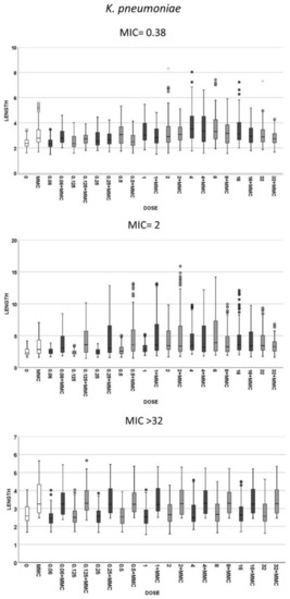 Three strains of E. coli and three of K. pneumoniae with increasing MICs of cotrimoxazole were incubated with increasing concentrations of the antibiotic, ranging from 0.06 to 32 mg/L, to evaluate both (1): the cotrimoxazole-induced lengthening (Figure 2) and (2) cotrimoxazole-induced suppression of MMC-linked elongation (Figure 3 and Figure 4). Given that the CLSI breakpoint concentration of susceptibility is 2/38 mg/L trimethoprim/sulfamethoxazole, two E. coli strains were categorized as susceptible (MICs 0.125 and 0.38 mg/L, respectively) and one resistant (MIC > 32 mg/L). Regarding K. pneumoniae, one was susceptible (MIC: 0.38 mg/L), one was at the susceptibility breakpoint (MIC: 2 mg/L) and one was resistant (MIC > 32/mg/L).