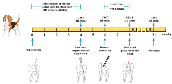 The traditional animal model for the study of apical periodontitis was induced by exposing the pulp cavity to the oral environment, to simulate the clinical pathological progression of primary root canal infection [11,12]. However, in secondary intraradicular infections post root canal therapy, with the reduction of availability resources, there exists an obvious shift in bacteria community from anaerobic Gram-negative bacteria and several Gram-positive rods into some Gram-negative bacteria, such as streptococci, Actinomyces species, lactobacilli and Enterococci [13]. At present, little research has been done on the animal study of persistent AP. In 2015, Lu et al. successfully established persistent AP models of rats with E. faecalis to mimic the clinical situation, which was accomplished by a two-step infection procedure [14]. However, because of the narrow pulp chamber and tiny root canal in the teeth of rats, it is subject to greater endodontic treatment failure by missing the root canal, teeth fracture or incomplete disinfection, making it a less-than-ideal model for the evaluation of dental materials in persistent AP. Due to the more anatomical similarity of teeth size and root canal thickness to people, beagle dogs were often used as animal models for evaluation of root canal disinfectants and root canal filling materials [15,16,17]. Thus, beagle dogs possess potential value to be an appropriate model for the study of endodontic material properties in persistent AP.