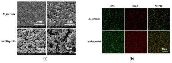 Single-species and multispecies biofilm were prepared following a previous study [23]. For single-species biofilm formation, E. faecalis cells were harvested at mid-logarithmic phase and incubated in 2 mL of BHI with 1% sucrose (106 colony-forming units (CFUs)/mL). For multispecies biofilm formation, bacterial suspensions mixed in BHI with 1% sucrose were cultured in 24-well plates which composed of the four species: E. faecalis (106 CFUs/mL), S. gordonii (106 CFUs/mL), A. naeslundii (106 CFUs/mL), and L. acidophilus (106 CFUs/mL). The culture medium refreshed every 24 h.