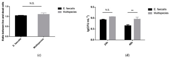 The biofilm formation of E. faecalis and multispecies models. (a) The scanning electron microscopy images of E. faecalis and multispecies biofilms with 5000× and 20,000× magnified visual fields; (b) the live/dead bacterial staining image of biofilms (live bacteria, stained green; dead cells, stained red); (c) the ratio of the live bacteria cells to dead cells was computed in line with 3 random sights of biofilms; (d) colony-forming units of bacteria in biofilms formed by E. faecalis and multispecies (n = 3). Data are presented as the mean ± standard deviation (** p < 0.01).