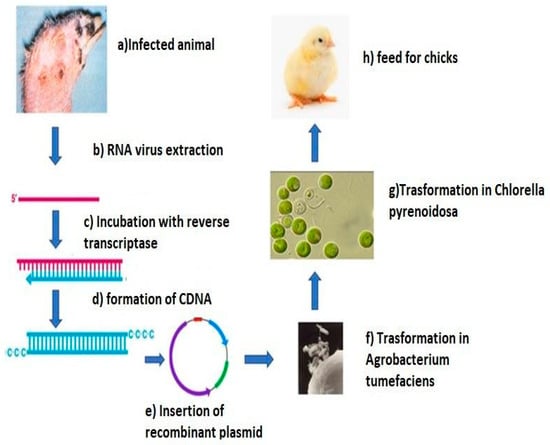- Reddy, P.H.; Johnson, A.M.A.; Kumar, J.K.; Naveen, T.; Devi, M.C. Heterologous expression of Infectious bursal disease virus VP2 gene in Chlorella pyrenoidosa as a model system for molecular farming. Plant CellTissue Organ Cult. 2017, 131, 119–126. [Google Scholar] [CrossRef]