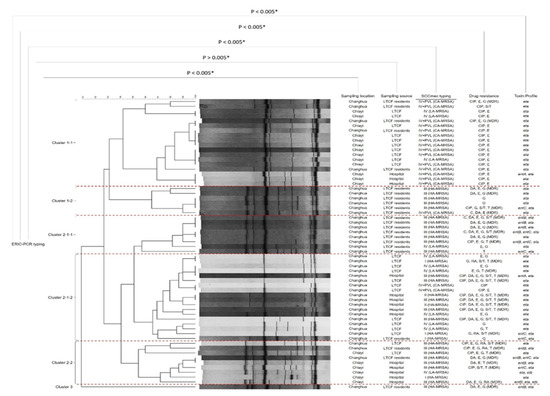 In contrast, isolates in sub-cluster 2-1-1 from Changhua hospital and LTCFs generally consisted of SCCmec III (HA-MRSA) with MDR isolates. This finding implied that a genetically similar type of MRSA had spread between LTCFs and hospitals. ERIC-PCR aided the discrimination of resistance patterns among SCCmec types reported in our previous study [37]. ERIC-PCR is a popular tool for determining the genetic relatedness of different multidrug-resistant pathogenic bacteria from environmental samples, and previous analyses are consistent with our results [45,46]. This conclusion is further supported by the chi-square statistical hypothesis, where the individual significance score was < 0.05 with ERIC-PCR results. A similar analysis, adopted by Akindolire et. al. to distinguish the genetic diversity of isolated MRSA strains from their samples, strongly supported our ERIC-PCR results [47]. Therefore, using the ERIC-PCR figure combined with more detailed information, including toxin profiles, sampling location, other typing methods, and drug-resistant profiles, is a favorable approach to provide a complete understanding of pathogen transmission, microbial contamination, and surveillance spot information.
