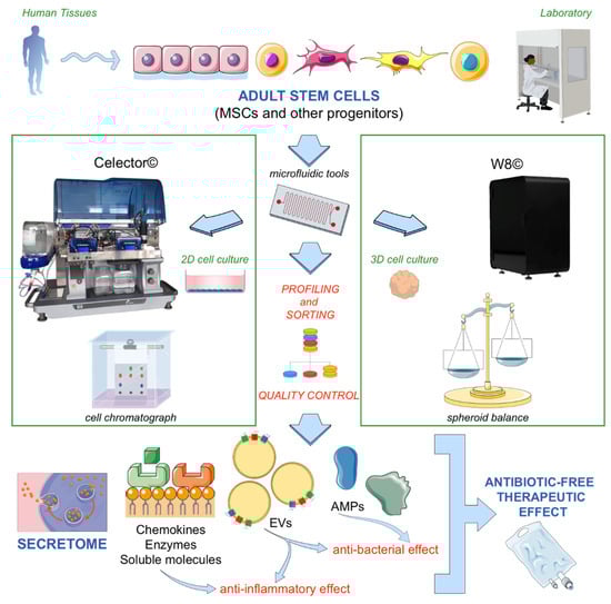 Stem cells are responsible for producing the mature cells of the organism. They participate in tissue homeostasis and cell renewal after birth. Mesenchymal stromal stem cells (MSCs) are somatic stem cells that repopulate the tissue of origin and display multipotency differentiation []. Their in vivo paracrine effects are critical for the resolution of tissue damage. Various stem cell populations can be isolated from perinatal tissues which are abundant sources of MSCs []. MSCs have been widely studied in translational medicine and frequently proposed as innovative drugs. MSC-based cell therapy involves the administration of MSCs to the receptor body, where they can move towards the affected tissues and contribute to healing. MSCs can transfer to the injured cells factors restraining injury and leading to tissue regeneration. MSCs can interact with the immune system and prevent infection via direct and indirect mechanisms []. In particular, the antimicrobial features are linked to paracrine release of several antimicrobial peptides (AMPs), with broad antibacterial properties, and specific extra cellular vesicles (EVs) secretion, including immunomodulatory factors. Depending on the origin of the tissue, MSCs differ functionally in their paracrine mechanisms and their secretome-derived products []. MSCs are considered medicines from a regulatory viewpoint [], and hence their quality needs to be controlled like other medicinal products []. After only minimal manipulation, MSC administration to humans can be considered as a form of transplantation []. On the other hand, the ex vivo preconditioning has been proposed as a way of priming MSCs’ immunological features []. Efforts focusing on characterizing selective MSC features can now exploit the microfluidic technology, which proving to hold great advantages in the biomedical field.