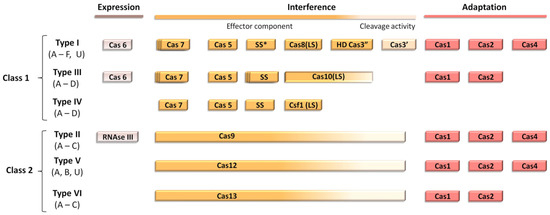 Modular organization of the different classes of CRISPR-Cas systems. Scheme adapted from Ishino et al. SS* indicates that the putative small subunit (SS) might be fused to the large subunit in several type I subtypes [13].
