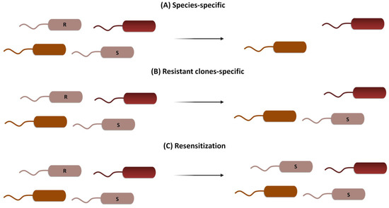 CRISPR-Cas can be used following three general strategies: (i) it can be directed to cleave species-specific genes to treat acute infections, resulting in a deployment of the bacteria of interest while maintaining the host’s microbiome unaltered [22]; (ii) it can be directed to cleave drug-resistance genes, eliminating bacteria harboring them while maintaining the viability of the wild-type susceptible clones and thus decolonizing patients [23]; or (iii) it can be directed to modify or silence resistance genes, introducing mutations that cause resistance genes’ loss of function while maintaining bacterial viability in a process known as resensitization [24] (Figure 2).
