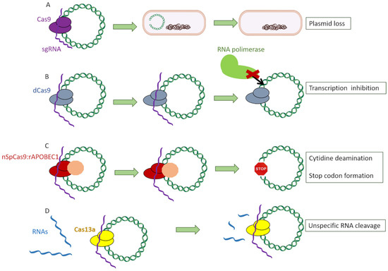 Different Cas proteins used to target antimicrobial genes: (A) Cas9, which specifically recognizes its target and induces a double-strand break. (B) dCas9, a defective Cas9 protein lacking the double-strand nuclease activity which specifically recognizes its target and stays attached to that region, hampering the binding of the RNA polymerase and thus the formation of the transcription preinitiation complex. (C) nSpCas9:rAPOBEC1, a Cas9 protein without nuclease activity fused to a deaminase, which causes the conversion of cytidine bases into thymine ones, thus creating a stop codon. (D) Cas13a protein, an RNA-specific endonuclease which indiscriminately cleaves RNA fragments upon activation by the recognition of its specific DNA sequence.