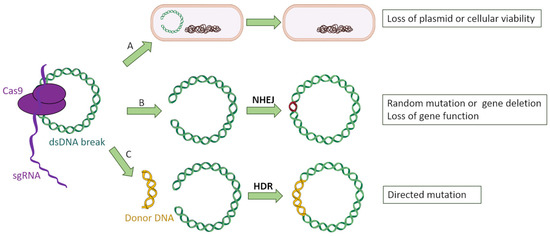 Among all CRISPR-Cas types, the most broadly used for genetic engineering is type II due to its simplicity and the fact that it employs a single nuclease with two catalytic domains for interference (Cas9), in contrast to the protein complex required for the types among class 1 [11,28]. The general scheme through which type II CRISPR-Cas system can be used to target bacterial genes is as follows: firstly, a chimeric sgRNA (an artificial RNA construct which fuses crRNA and tracrRNA) is designed to be complementary to the target sequence in the bacterial gene of interest. The chosen sequence has to be unique within the bacterial genome and mobilome so that it only attaches to the desired gene, as well as possessing a PAM. Then, sgRNA:Cas9 complexes are recruited and cleave the target sequence within the bacterial genome, producing blunt ends [29]. This chromosomal double break poses a serious risk for the bacterial cell’s integrity, and it can be mended through nonhomologous end-joining repair (NHEJ) [30], which is error prone and often leads to loss of protein function by inserting aleatory nucleotides or even the loss of the cell’s viability [10]. The cytotoxicity of targeting chromosomal self-genes has been previously shown by Vercoe and colleagues in Pectobacterium artrosepticum strains [31]. In this study, the bacteria’s own CRISPR machinery was exploited by introducing expression vectors which coded for specific crRNAs targeting three nonessential chromosomal genes. As a result, a reduction of a hundred-thousand-fold in viable bacterial counts was observed, as well as the filamentation of surviving cells. In another study, Hullahali and colleagues demonstrated that the growth of Enterococcus faecalis strains is impaired when its own CRISPR machinery is modified to target self-genes [32]. However, this cytotoxicity can be prevented by inserting into the cell an artificial DNA fragment with a copy of the target gene, serving as template for homology-directed repair (HDR) [33] instead of NHEJ. If this copy is engineered with desired mutations, the targeted bacteria would be able to acquire them through a recombination process, resulting in a knockdown of the gene of interest while maintaining the cell’s viability (Figure 4).