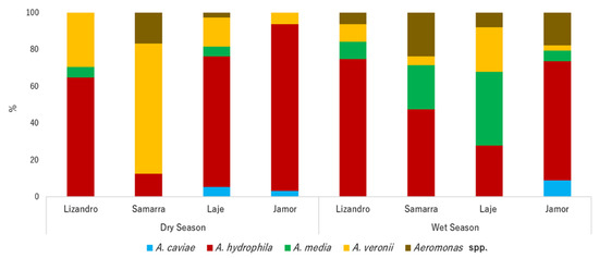 Aeromonas spp. prevalence was high in individuals from both seasons and locations (dry season = 100%, wet season = 92.2%). In total, a bacterial library of 376 isolates of Aeromonas was established. After clone elimination, 223 isolates were further studied. Species composition differed among locations and seasons (p < 0.001), revealing specific structures for each river in each season (Figure 1). In general, A. hydrophila was the most prevalent species isolated from the sampled animals in both seasons, despite reaching higher prevalence values in those from the dry season, followed by A. veronii and A. media. In the individuals sampled in the dry season, a predominance of A. hydrophila was observed in the Jamor river, outnumbering other species, while fishes from Samarra river presented higher levels of A. veronii. In the wet season, despite high levels of A. hydrophila in the sampled animals, individuals sampled in Jamor presented higher levels of A. caviae. On the other hand, animals from Laje presented higher values of A. media and A. veronii. The prevalence of A. veronii in fishes from Samarra was lower than the prevalence registered in the dry season.