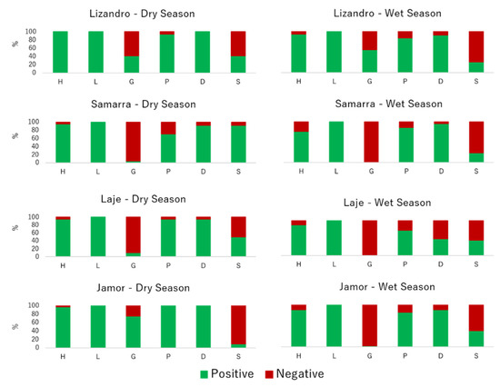 Regarding the virulence signatures registered for isolates from each sampling location, shifts occurred for selected virulence factors between isolates from different locations and across seasons (Figure 2). Slime production varied significantly between isolates from different locations (p < 0.001), with higher prevalence in those from samples collected in Samarra, while the majority of the slime-producing strains were A. veronii. DNase prevalence was lower in isolates collected in the wet season (p < 0.001) and influenced by the origin (p < 0.001), with lower positive prevalence in those sampled in Laje river. Most of the DNase-negative isolates obtained in samples from this river were A. media. Regarding gelatinase prevalence, a higher positive prevalence was recorded on isolates from the dry season and from Lizandro and Jamor (p < 0.001). The vast majority of these isolates were A. hydrophila. For hemolytic activity, only season affected the prevalence of positive results (p = 0.012), with isolates from samples collected in the dry season presenting more positive results. Regarding protease, the sampling season influenced the prevalence of positive results (p = 0.024), since the isolates from dry season samples presented a higher prevalence of this virulence factor.