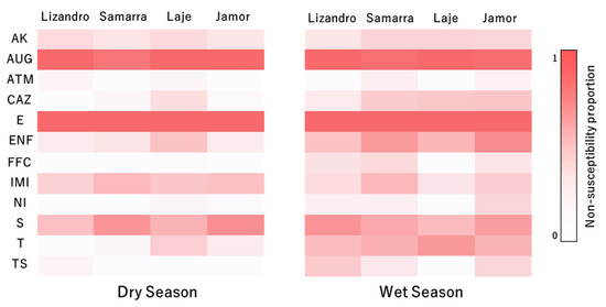 Regarding the isolates’ resistance profile for each antimicrobial tested, fluctuations in the relative proportion of each susceptibility category occurred for the evaluated panel of antibiotics, both between locations and seasons (Figure 3). Regarding the results for ceftazidime, there was a higher prevalence of isolates presenting a non-susceptible status in samples from the wet season (p < 0.001) when compared to the dry season and a lower prevalence of non-susceptible status in those from Lizandro (p = 0.027) when compared to Jamor. In relation to enrofloxacin, similar trends to ceftazidime regarding season (p < 0.001) and location (p = 0.023) were observed. Regarding florfenicol (p = 0.006), nitrofurantoin (p = 0.015), tetracycline (p = 0.002) and sulfamethoxazole/trimethropim (p < 0.001), a higher prevalence of isolates with a non-susceptible status were registered in the wet season. For streptomycin, a lower prevalence of isolates with non-susceptible status occurred in Laje (p = 0.011) when compared to Jamor.