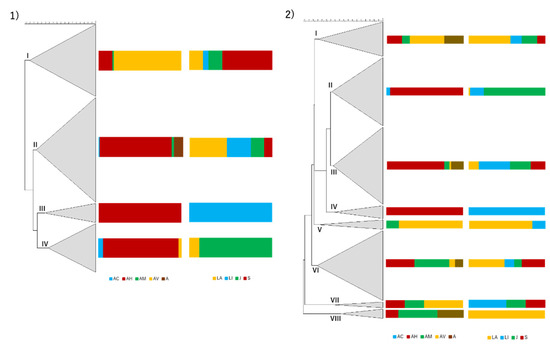 Hierarchical numerical analysis of the isolates recovered from samples collected in the dry season (1) and wet season (2). The dendrograms were based in the PCR fingerprints obtained with the AP5 and AP3 primers in a composite approach using for similarity calculation the Pearson correlation coefficient. Clustering was achieved with UPGMA. Regarding the entire dendrograms, cophenetic correlation coefficients are 0.83 for the dry season and 0.79 for the wet season. The scale used represents the percentage of similarity between the PCR fingerprints. The first column represents the dendrogram, the second the relative abundance (%) of Aeromonas species and the third the relative proportion (%) of isolates based on the river of origin. AC—A. caviae, AH—A. hydrophila, AM—A. media, AV—A. veronii, A—Aeromonas sp., LA—Laje, LI—Lizandro, J—Jamor, S—Samarra.