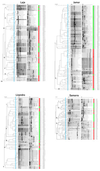 Dendrograms of isolates based on the composite analysis of RAPD fingerprints with primers Ap3 and Ap5 (Pearson correlation coefficient and UPGMA clustering) from each of the sampling locations. Cophenetic correlation coefficients are as follows: Lizandro—0.85, Samarra—0.86, Laje—0.83, Jamor—0.87. Differential coloration represents sampling season in which the isolate was collected: Red—Dry Season; Green—Wet Season.