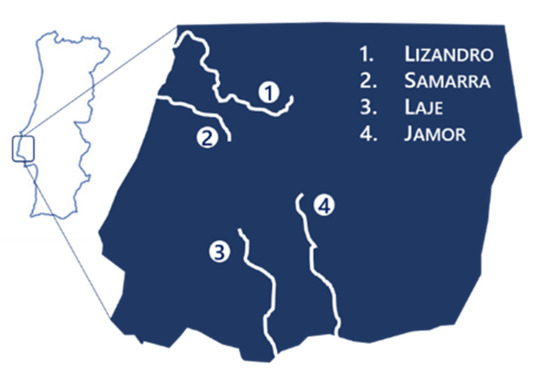 - Lopes, J. Action plan for the fish communities on the streams of the Sintra-Cascais Natural Park. Master’s Thesis, University of Lisbon, Lisbon, Portugal, 2014. (In Portuguese). [Google Scholar]
