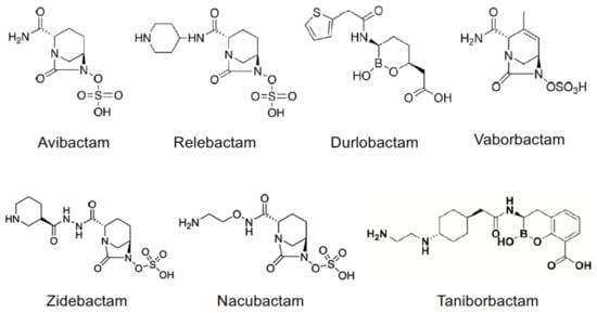 The most recent BLIs belong to diazabicyclo[3.2.1]octanone (DBO), boronic acid and pyridine-2-carboxylic acid classes, and they offer a different binding kinetics with respect to the oldest penicillanic acid sulfones. Avibactam {AVI, [(2S,5R)-7-oxo-1,6-diazabicyclo[3.2.1]octane-2-carboxamide]}, relebactam {REL, (1R,2S,5R)7-oxo-2-(piperidin-1-ium-4-ylcarbamoyl)-1,6-diazabicyclo[3.2.1]octan-6-yl sulfate} and durlobactam {DUR, [(2S,5R)-2-carbamoyl-3-methyl-7-oxo-1,6-diazabicyclo[3.2.1]oct-3-en-6-yl] hydrogen sulfate} commonly show the presence of a DBO moiety, as well as zidebactam {ZID, [(1R,2S,5R)-7-oxo-2-({[(3R)-piperidin-3-yl]formohydrazido}carbonyl)-1,6-diazabicyclo[3.2.1]octan-6-yl]oxidanesulfonic acid} and nacubactam {NAC, [(1R,2S,5R)-2-[(2-aminoethoxy)carbamoyl]-7-oxo-1,6-diazabicyclo[3.2.1]octan-6-yl]oxidanesulfonic acid}. Vaborbactam {VAB, (3R,6S)-2-hydroxy-3-[[2-(2-thienyl)acetyl]amino]-1,2-oxaborinane-6acetic acid} and taniborbactam {TAN, (3R)-2-hydroxy-3-{2-[(1r,4r)-4-[(2-aminoethyl)amino]cyclohexyl]acetamido}-3,4-dihydro-2H-1,2-benzoxaborinine-8-carboxylic acid} are characterized by the presence of a cyclic boronic acidic scaffold. The inhibitory activity of new BLIs is broad and more potent than that of β-lactam BLIs, as it was formerly demonstrated for AVI [12]. Moreover, DBO compounds are capable of inhibiting penicillin-binding proteins (PBP) thus showing a “β-lactam enhancer” activity [13,14] and a synergistic bactericidal activity in combination with β-lactam [15], even against MBL-producing bacteria [16,17].
