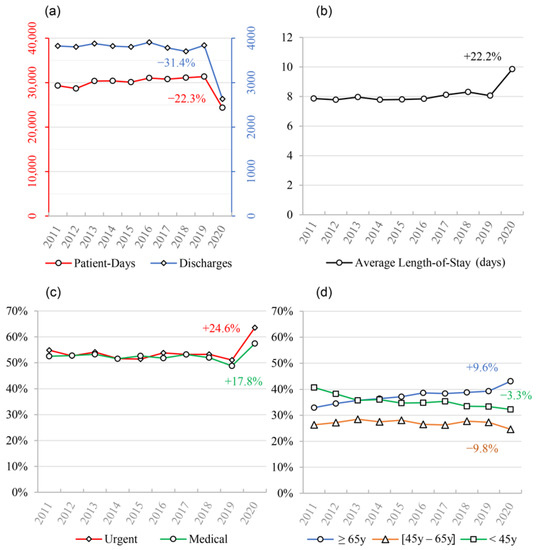 Summary of CHUSJ’s population characteristics observed between 2011 and 2020. (a) March–May average discharges and patient-days; (b) March–May average length-of-stay; (c) March–May average proportion of urgent and medical admissions; (d) March–May average proportions of age groups admitted to CHUSJ. Annual percentage changes (APCs) are shown within the graphs.
