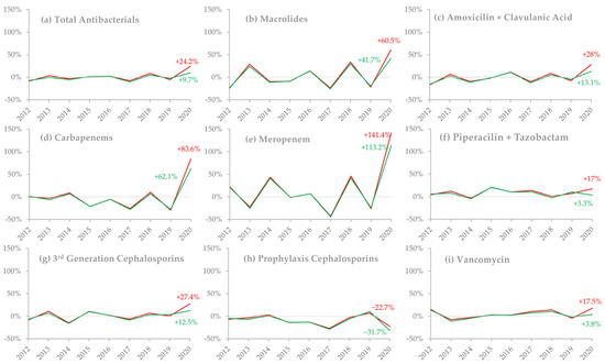 Annual percentage changes (APCs) in antimicrobial consumption between 2011 and 2020, stratified by different consumption indicators and drug groups. March–May DDD/100 discharges are represented by the red line, and March–May DDD/100 patient-days by the green line. Values for the 2020 annual percentage change are shown within the graphs. (a) Total antibacterials; (b) macrolides; (c) amoxicillin/clavulanic acid; (d) carbapenems (ertapenem/imipenem/meropenem); (e) meropenem; (f) piperacillin/tazobactam; (g) third-generation cephalosporins (ceftriaxone/ceftazidime/cefotaxime); (h) prophylaxis cephalosporins (cefazolin/cefoxitin); (i) vancomycin.