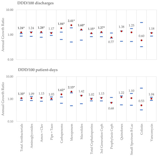 Annual growth ratio in 2020 and expected reference values for the period of 2011–2019. Calculated 2020 growth ratios (Indicatoryear (n+1)/Indicatoryear (n)) are represented by the red dot, whereas the upper and lower limits of the calculated reference values for 2011–2019 are represented by the blue lines. (*) Growth ratios outside the reference values were considered statistically significant. Growth ratios correspond to the logarithmic values of the APCs. As an example: total antibacterial use expressed as DDD/100 patient-days increased by 10% in 2020 (annual growth ratio = 1.10), whereas cefazolin/cefoxitin use decreased by 32% (annual growth ratio = 0.68).
