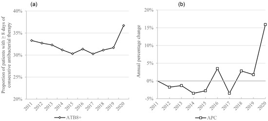 Extended antimicrobial therapy: (a) March–May average proportion of patients with ≥ 8 days of antibacterial therapy (ATB8+); (b) annual percentage change of March–May average ATB8+.