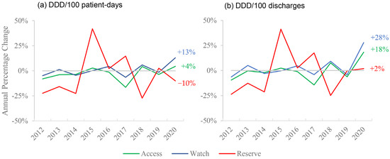 Annual percentage change of March–May consumption of different AWaRe groups: (a) analyzed by DDD/100 patient-days; (b) analyzed by DDD/100 discharges.