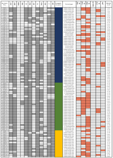 - El-Sharkawy, H.; Tahoun, A.; El-Gohary, A.E.; El-Abasy, M.; El-Khayat, F.; Gillespie, T.; Kitade, Y.; Hafez, H.M.; Neubauer, H.; El-Adawy, H. Epidemiological, molecular characterization and antibiotic resistance of Salmonella enterica serovars isolated from chicken farms in Egypt. Gut Pathogens. 2017, 9, 8. [Google Scholar] [CrossRef] [PubMed]