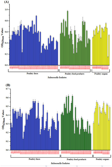 Results of biofilm formation assay. X-axis: Salmonella isolates from poultry droppings; poultry food products; poultry organs at two temperatures, (A): 37 °C; (B): 30 °C evaluated by crystal violet assay. Biofilm formation was assessed by staining the attached bacteria with 0.2% CV and measuring the OD values at 620 nm after 48 h growth. Error bars represent standard deviations between three replicates.